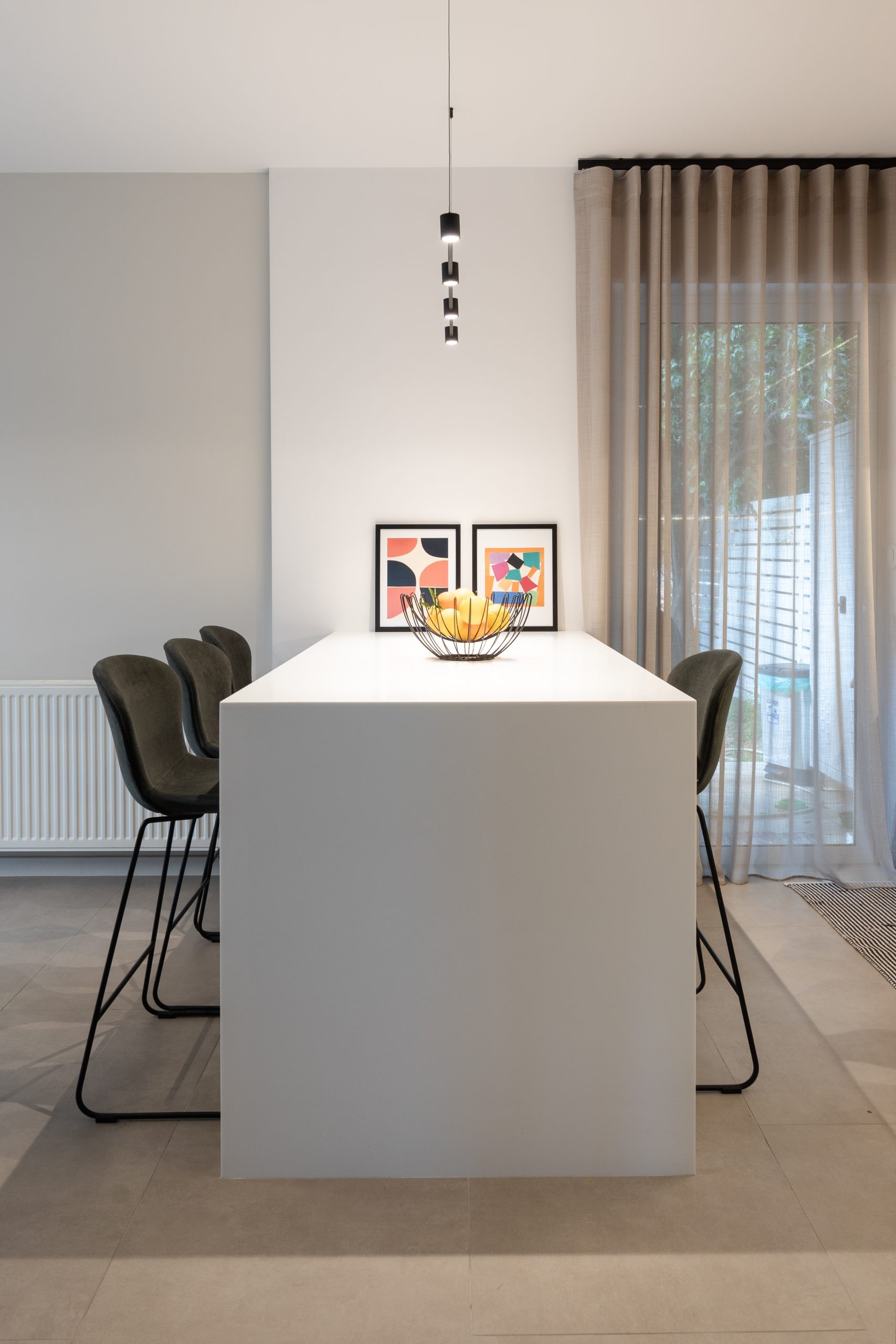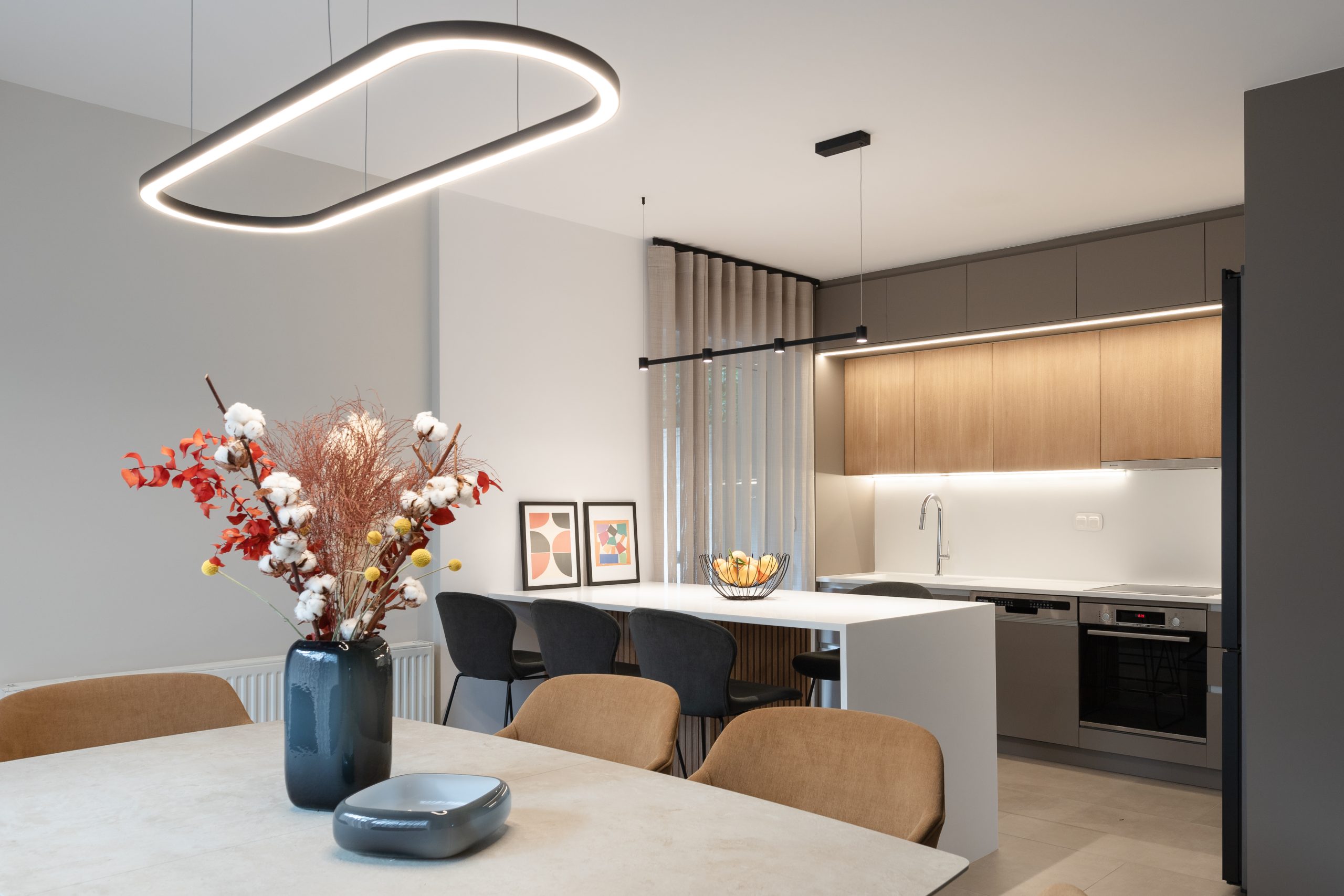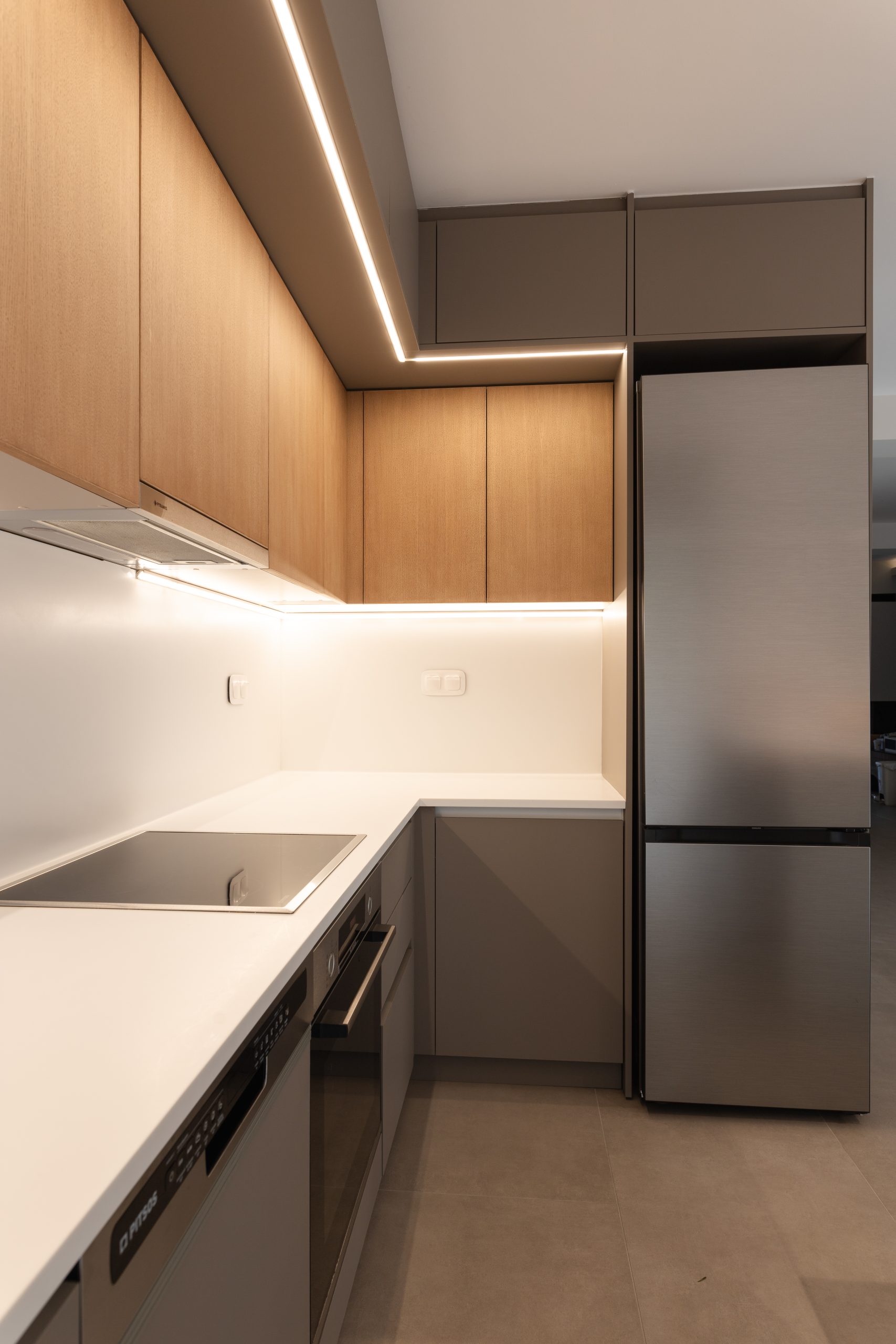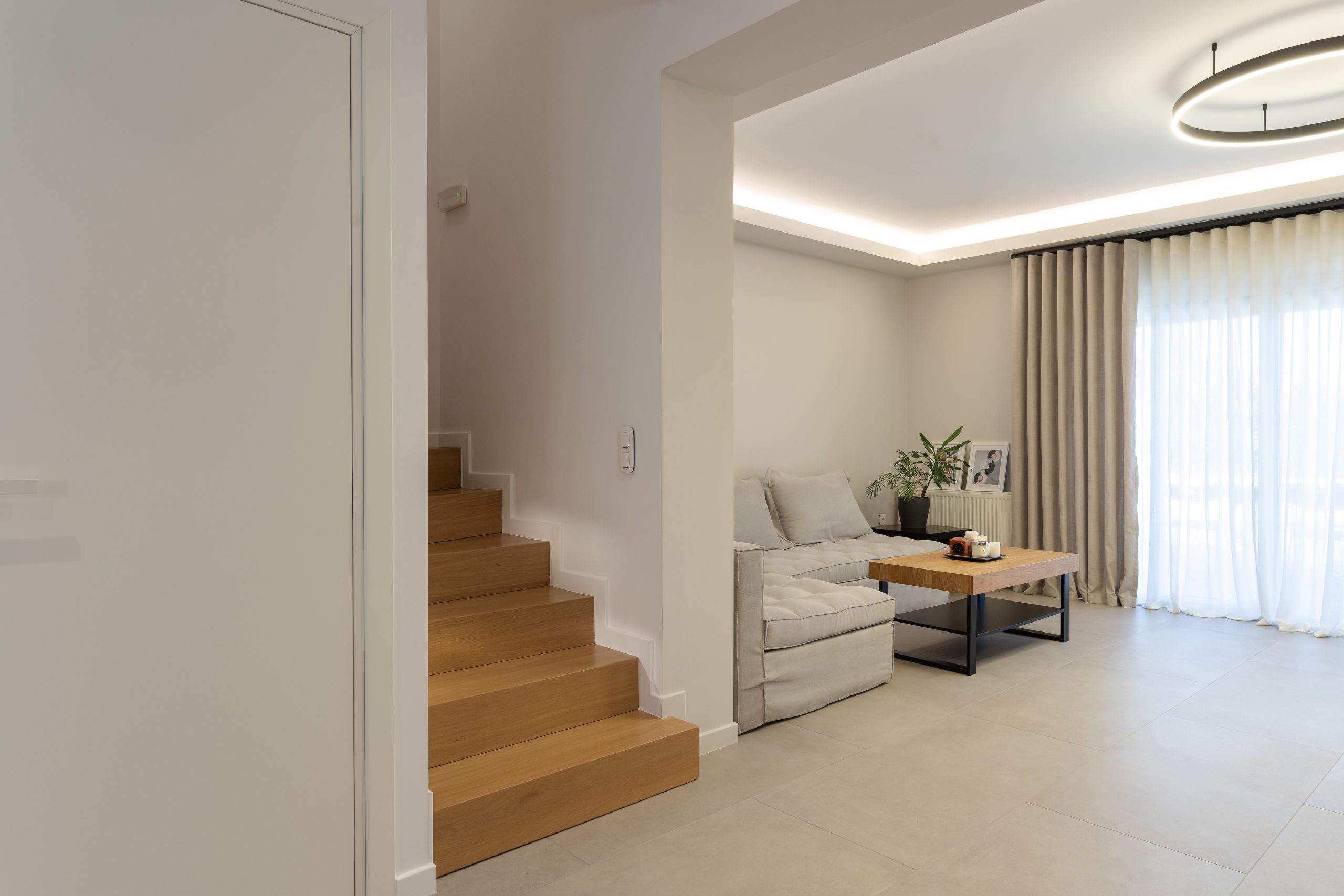 To έργο αφορά στην αποπεράτωση των όψεων και των εσωτερικών χώρων, υφιστάμενης διώροφης μεζονέτας με υπόγειο, επιφάνειας 150,00 τ.μ. Οι εξωτερικές όψεις επενδύθηκαν με θερμοπρόσοψη και χρωματίστηκαν με αποχρώσεις του γκρι και του λευκού για την ανάδειξη των μορφολογικών τους στοιχείων. Στον εσωτερικό σχεδιασμό βασική επιδίωξη ήταν η δημιουργία ενιαίων λειτουργικά και οπτικά χώρων στην στάθμη διημέρευσης της κατοικίας, με ένα λιτό και μοντέρνο αισθητικό αποτέλεσμα. Οι neutral χρωματισμοί είναι κυρίαρχοι εσωτερικά σε συνδυασμό με ξύλινες επιφάνειες δρυός στα δάπεδα του κεντρικού κλιμακοστασίου και στους χώρους ύπνου.